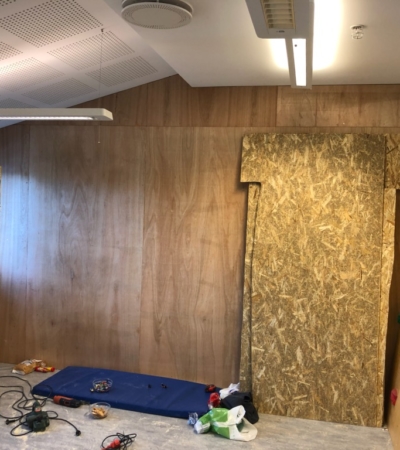 Vi lager også en klatrevegg. Hele veggen blir foliert med bilde av et helt tre. Klatreklosser blir så montert